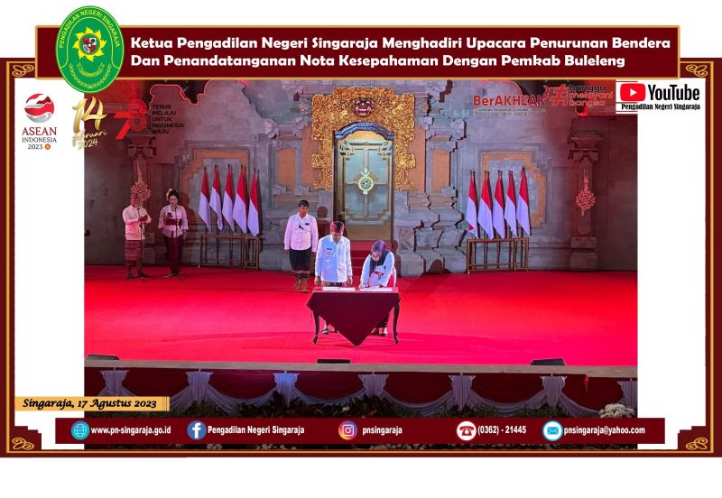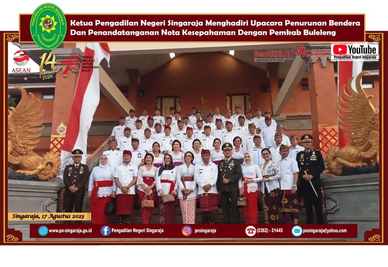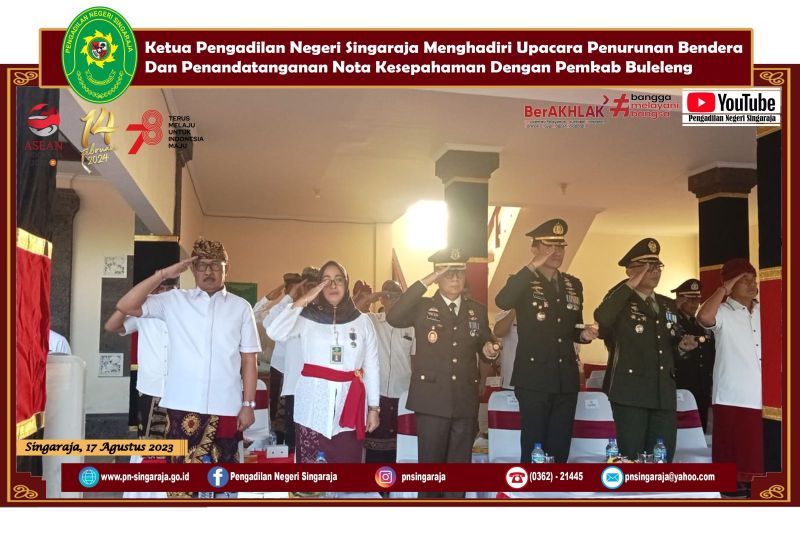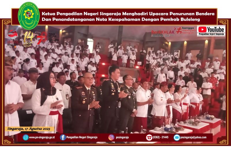 SINGARAJA – Pada pukul 16.30 WITA tanggal 17 Agustus 2023 di Lapangan Ngurah Rai Singaraja berlangsung upacara penurunan bendera. Upacara tersebut dihadiri oleh berbagai instansi baik instansi pemerintah daerah maupun instansi lainnya. Ketua Pengadilan Negeri Singaraja mengikuti langsung kegiatan tersebut di tempat. Kemudian, pada pukul 18.00 WITA kegiatan dilanjutkan dengan resepsi HUT Republik Indonesia ke – 78 yang diadakan di Gedung Kesenian Gde Manik. Salah satu agenda dari resepsi ini adalah penandatanganan nota kesepahaman antara pemerintah Kabupaten Buleleng dengan Pengadilan Negeri Singaraja. Acara diakhiri dengan ramah tamah.