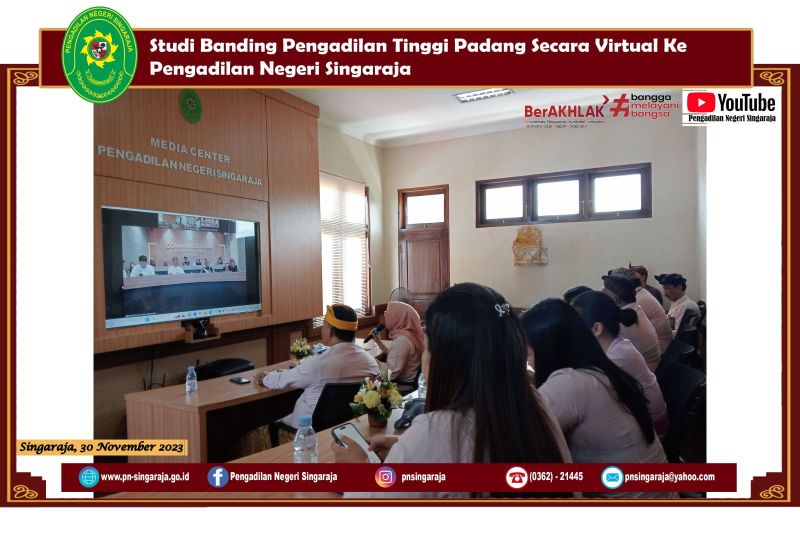 SINGARAJA – Pengadilan Negeri Singaraja diberikan kepercayaan oleh Pengadilan Tinggi Denpasar sebagai salah satu Pengadilan Umum Tingkat Pertama di wilayah Bali yang diberikan kesempatan untuk memaparkan inovasi dan capaian yang telah didapatkan. Pemaparan tersebut disampaikan secara virtual sebagai bagian dari rangkaian kegiatan studi banding oleh Pengadilan Tinggi Padang ke wilayah Pengadilan Tinggi Denpasar melalui Ruang Media Center Pengadilan Negeri Singaraja pada 30 November 2023.